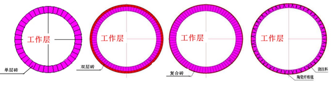 回轉窯焚燒爐最關鍵設備即為回轉窯本體,因其是一種動態(tài)運轉設備,對內(nèi)襯結構設計要求較高,首先要確保耐火內(nèi)襯在動態(tài)高溫狀態(tài)運行下整體內(nèi)襯的穩(wěn)定性,防止耐火磚掉磚、抽簽等問題。對于危廢回轉窯系統(tǒng)而言,由于轉速比較慢,一般在1轉/分以下,可以根據(jù)廠房設計和節(jié)能要求選擇單層磚、雙層磚、復合磚和整體澆注等不同結構,如圖3所示。回轉窯耐火材料總厚度一般是250-300mm不等,其中工作層耐火磚材質一般根據(jù)處理溫度和危廢種類不同,可以選擇高鋁質、剛玉莫來石質以及鉻鋯剛玉質耐火材料等。