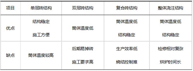 以上幾種設計方案優(yōu)缺點如表1所示。相比較而言,耐火磚方案檢修和更換方便,受環(huán)境和人為因素影響較小。現(xiàn)在新建項目回轉窯基本都是室外設計,隨著提產(chǎn)和環(huán)保要求,采用單層結構穩(wěn)定性較好,高溫區(qū)可以考慮凹槽復合磚方式,降低外壁溫度。而且從防腐蝕角度,筒體外壁溫度控制在160-320℃區(qū)間,比較合理。
