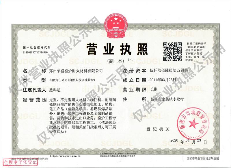 鄭州榮盛窯爐耐火材料有限公司營業執照公示